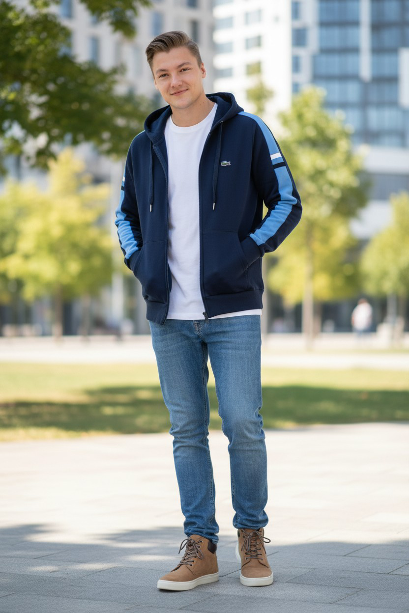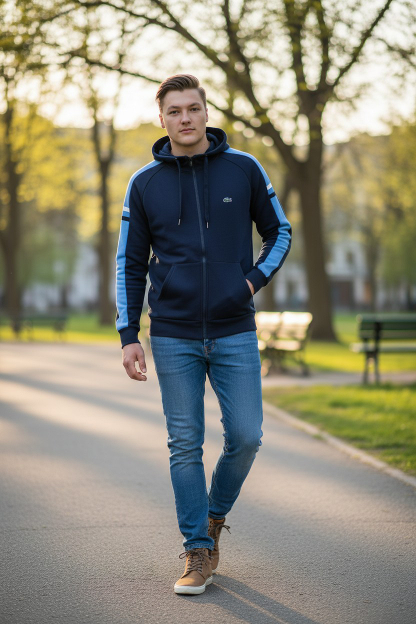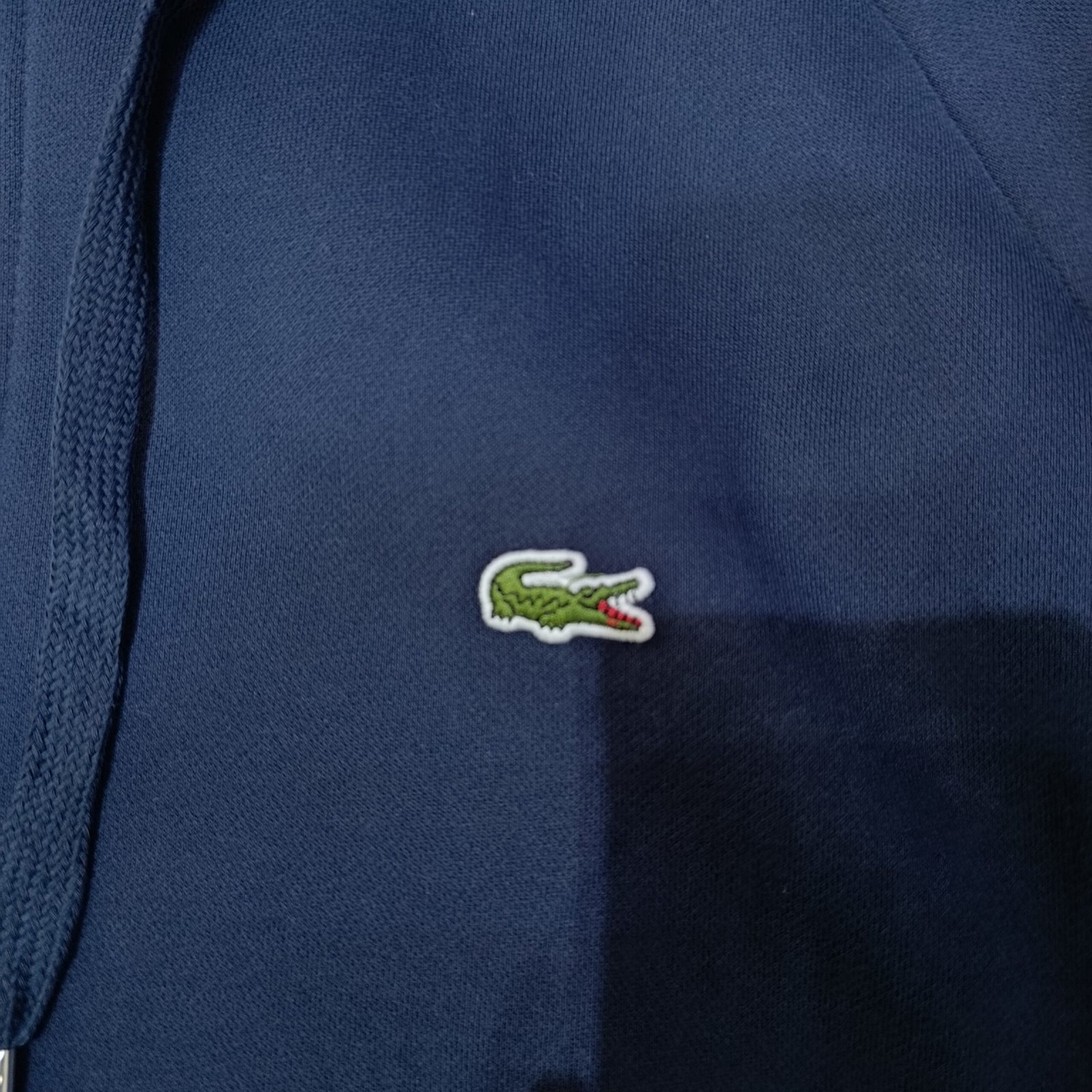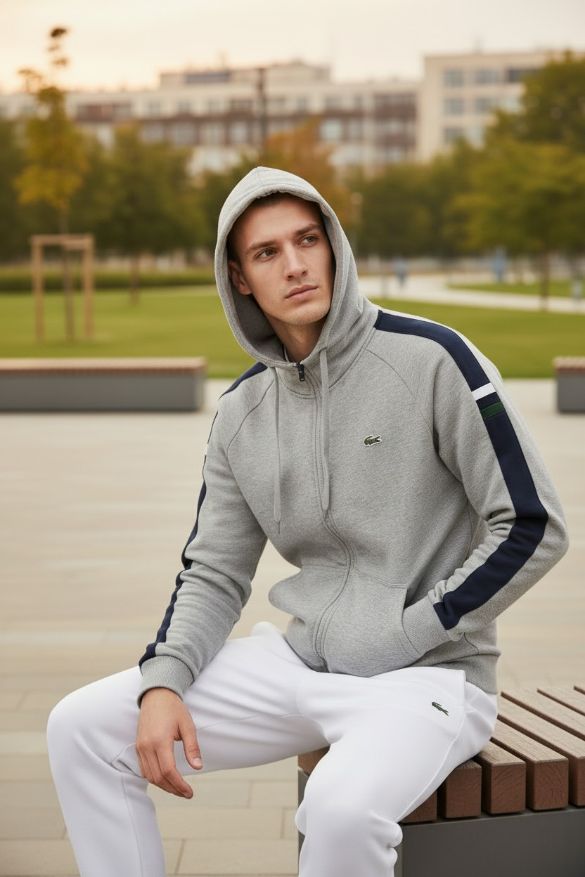 Buzo tipo hoodie para hombre confeccionado en felpa de algodón con mezcla de poliéster, que ofrece tacto suave, abrigo ligero y buena resistencia al uso diario. Incorpora cierre completo en cremallera, capucha con cordón ajustable, bolsillos frontales y franjas en contraste sobre las mangas, rematado con el icónico cocodrilo bordado en el pecho para un estilo deportivo y elegante.