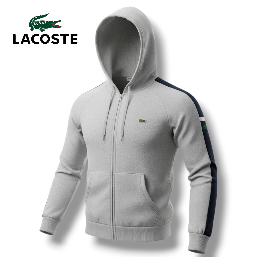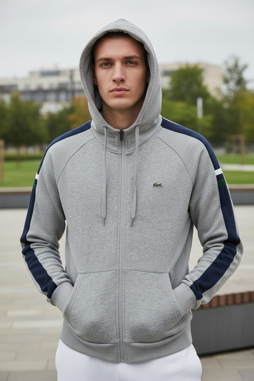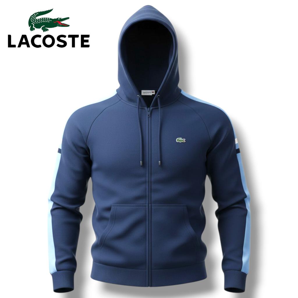 Buzo hoodie Lacoste azul y gris para hombre, con cremallera completa, capucha ajustable y franjas en contraste, perfecto para outfits urbanos y relajados.