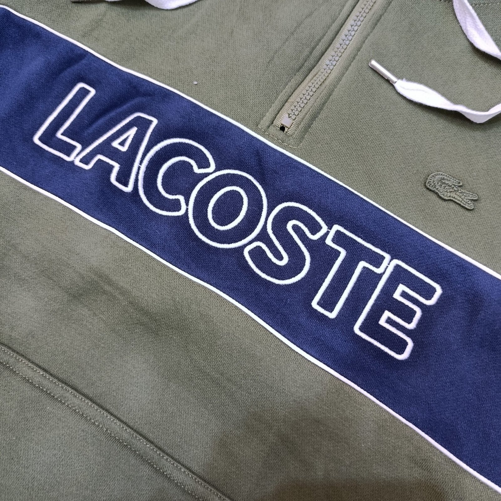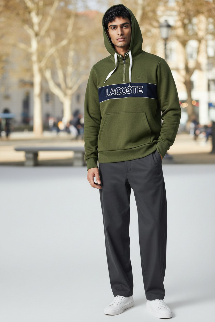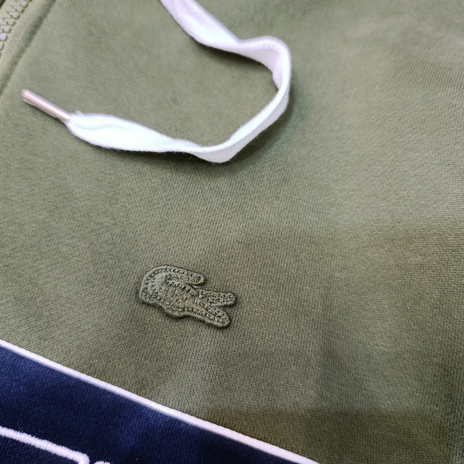 Buzo hoodie Lacoste verde oliva, con cremallera, capucha ajustable y lettering “LACOSTE” grande en el pecho, perfecto para looks urbanos.
