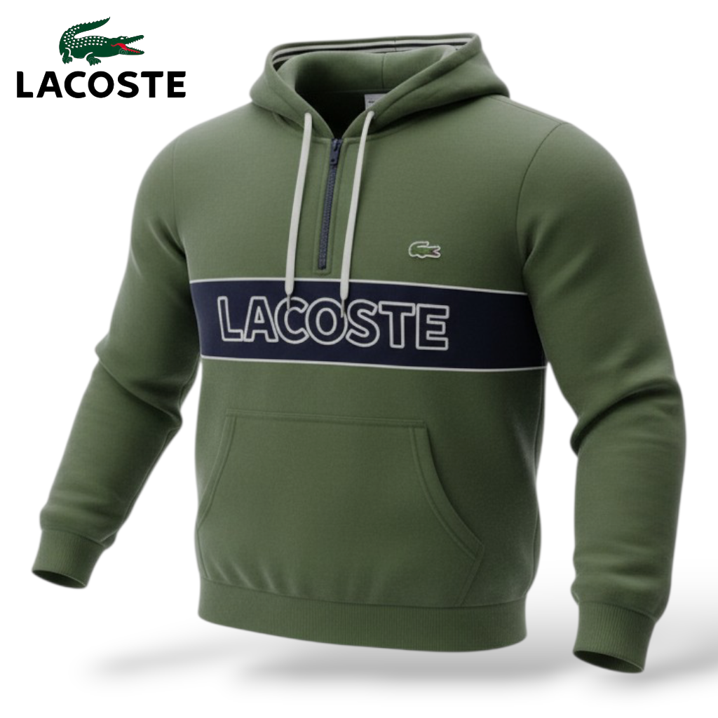 Buzo tipo hoodie para hombre en color verde oliva, confeccionado en felpa suave de algodón orgánico mezclado con poliéster para máximo confort y transpirabilidad. Destaca por su cierre frontal en cremallera, capucha con cordones ajustables, banda horizontal en el pecho con el nombre “LACOSTE” en letras grandes contrastadas y logos del cocodrilo bordados en el lado izquierdo.