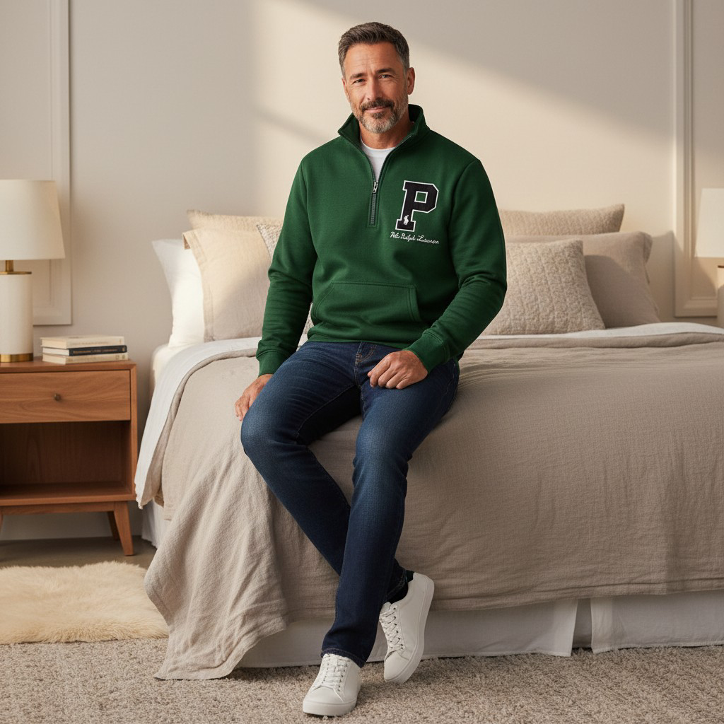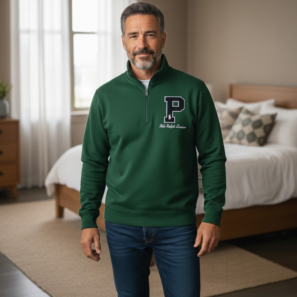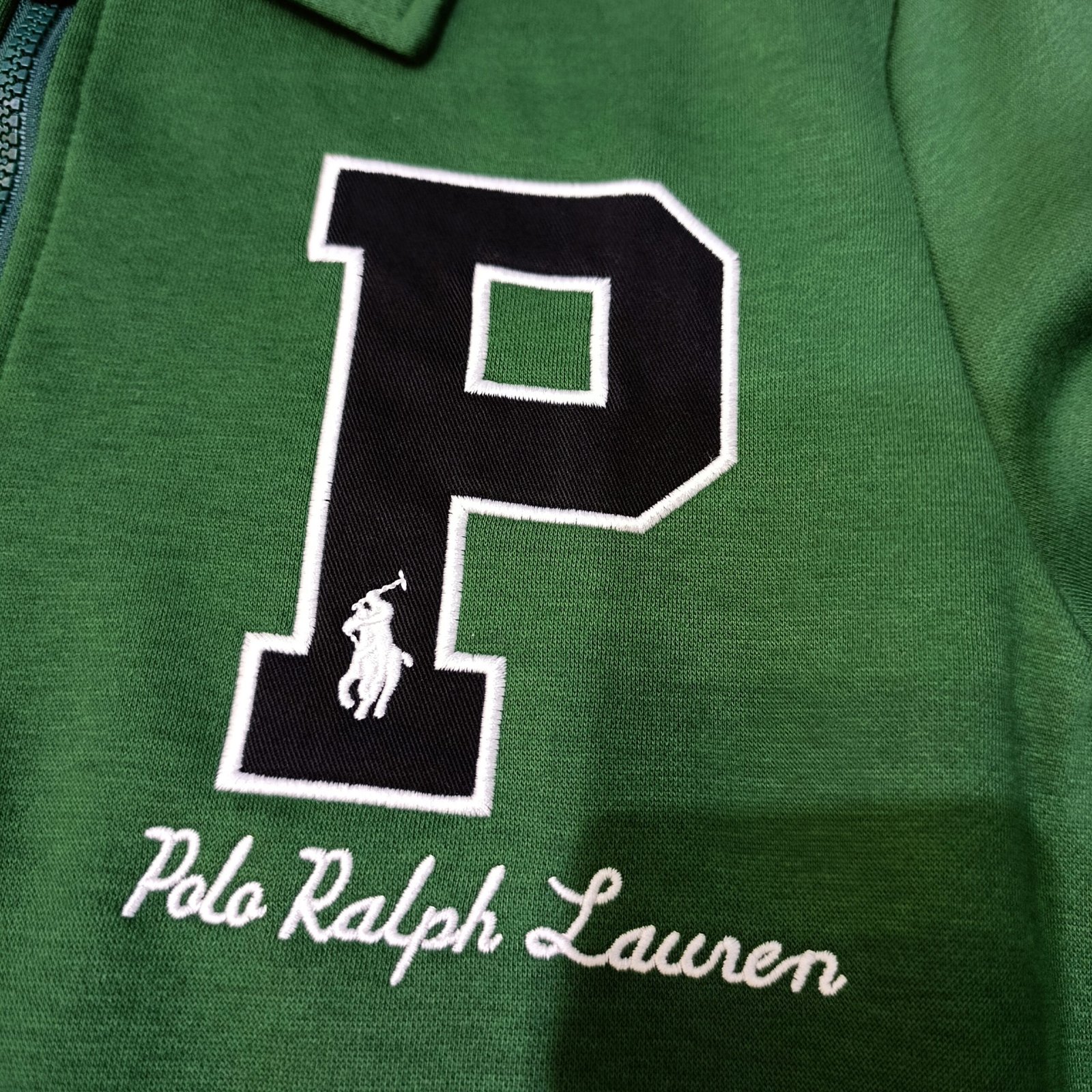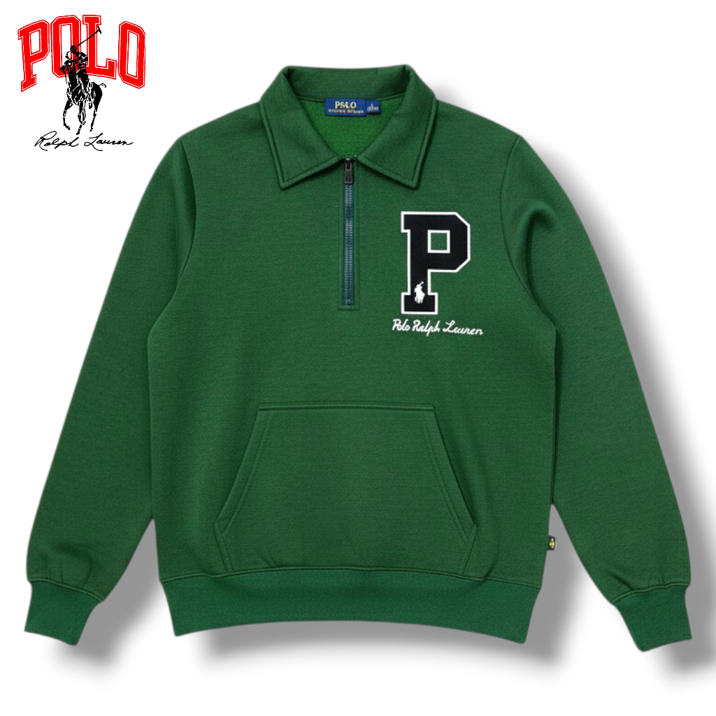 Buzo Polo Ralph Lauren media cremallera en verde, 100% algodón, con logo P bordado y diseño preppy. Comodidad premium para cualquier ocasión.