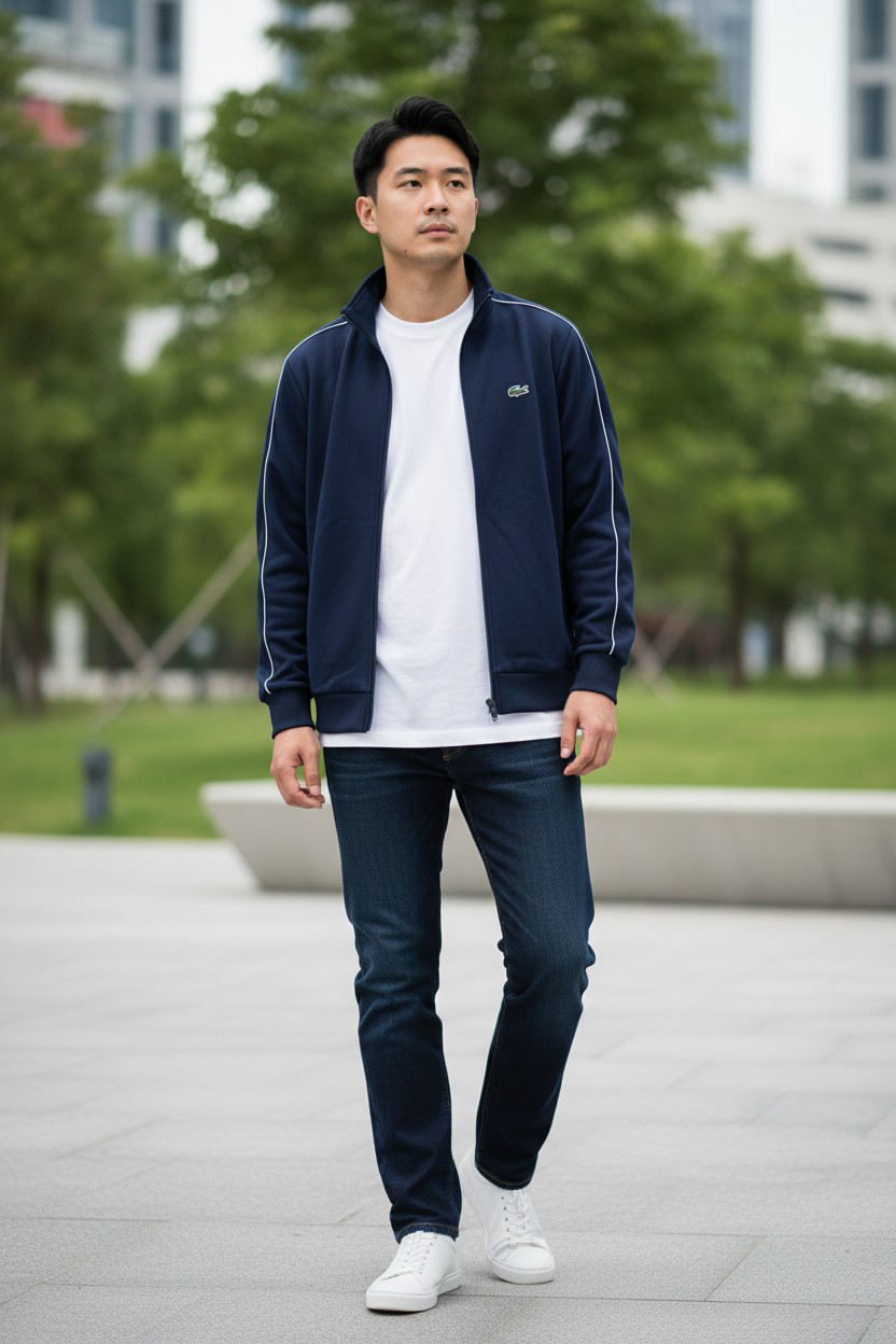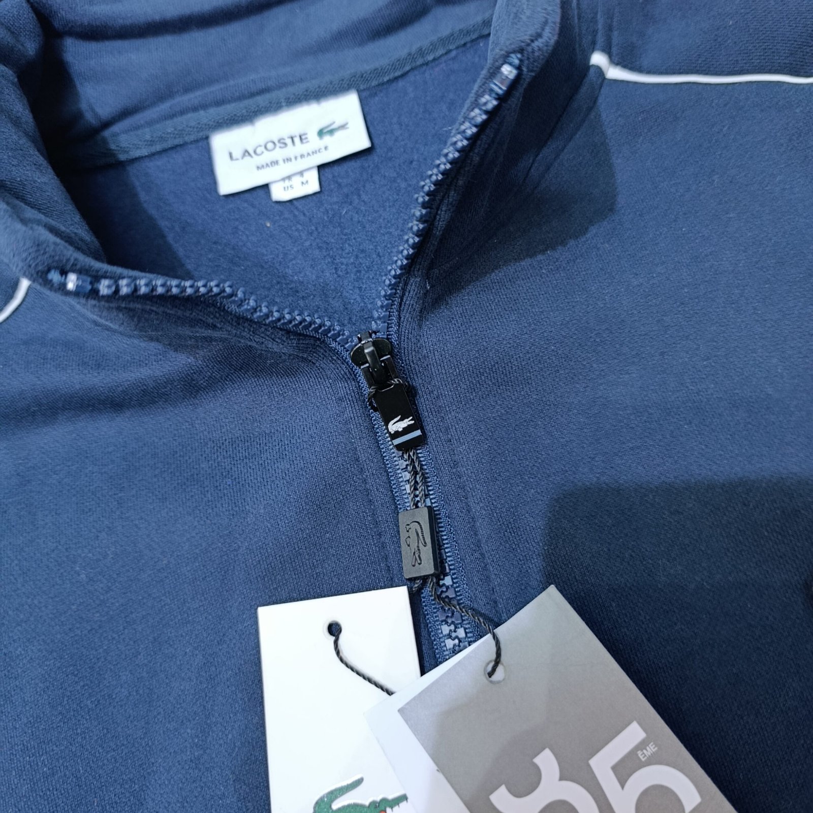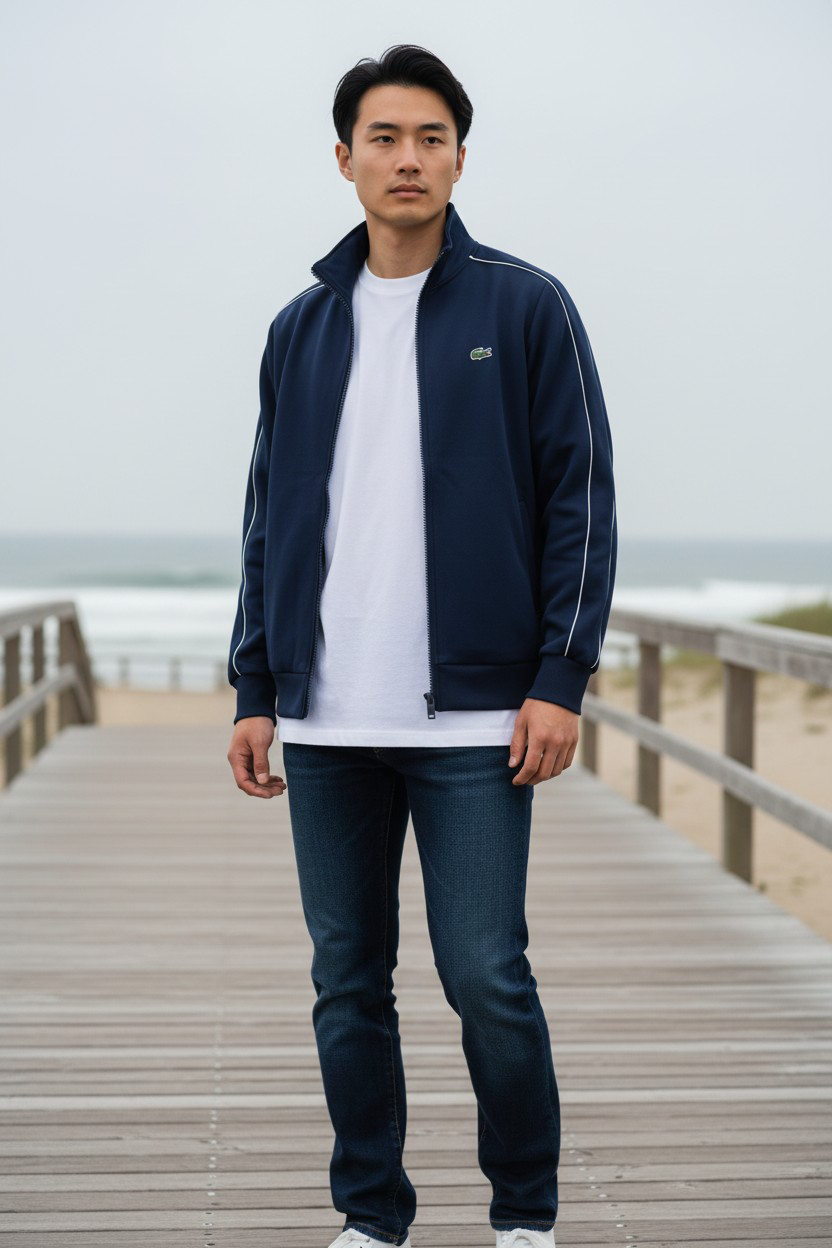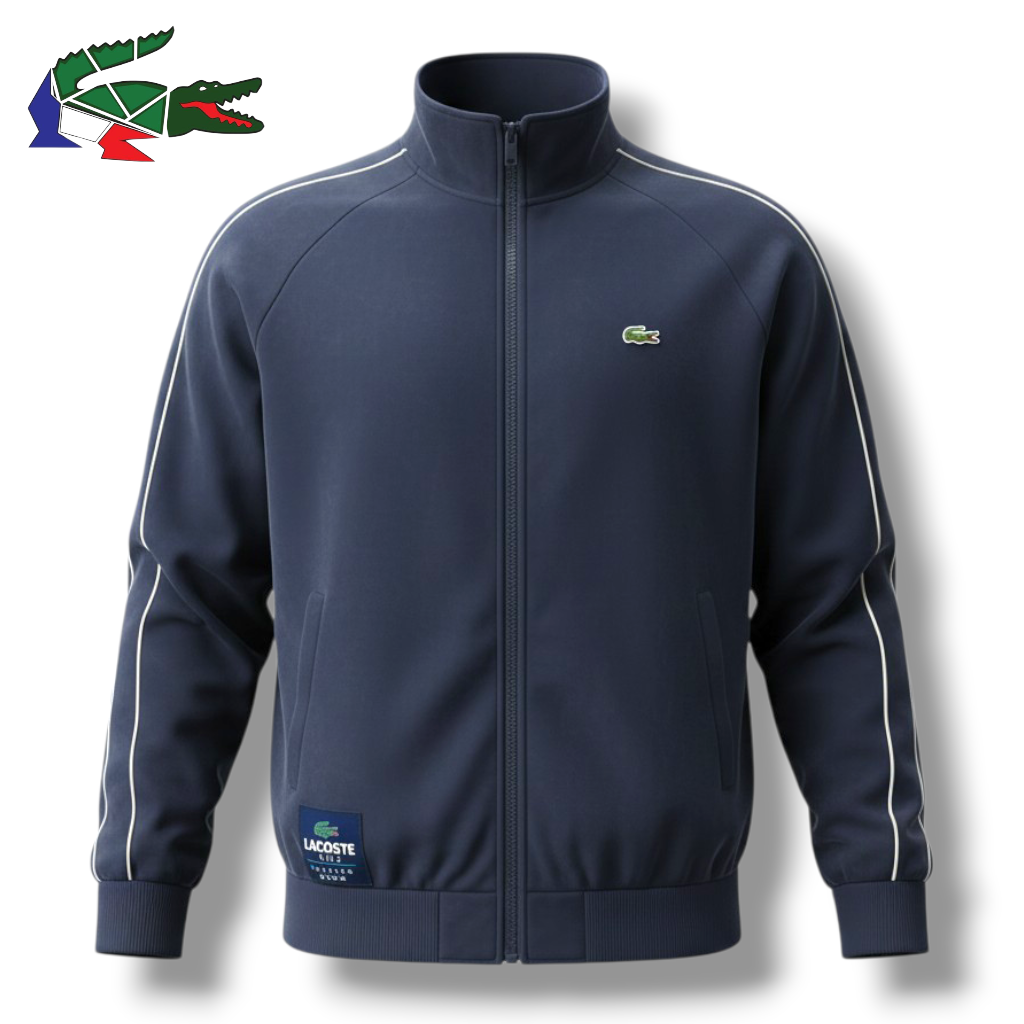 Esta chaqueta deportiva inspirada en el estilo icónico de Lacoste destaca por su diseño elegante y funcional. Confeccionada en material suave y resistente, brinda comodidad y libertad de movimiento ideal para el día a día. Su diseño en color azul marino incorpora cierre frontal completo, cuello alto y detalles de líneas en contraste en las mangas que aportan un toque deportivo y moderno. El logo bordado en el pecho añade autenticidad y estilo, convirtiéndola en una prenda versátil perfecta para looks casuales o urbanos.