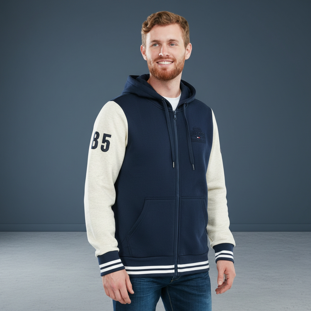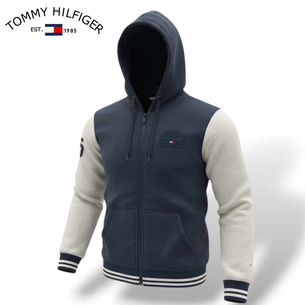 Hoodie Tommy Hilfiger para hombre con diseño colorblock en contraste, cuerpo azul marino y mangas claras, perfecto para outfits casuales y deportivos. Confeccionado en felpa suave tipo fleece, ofrece calidez, comodidad y libertad de movimiento para el día a día. Incluye capucha ajustable con cordones, cierre frontal completo, bolsillos tipo canguro y rib acanalado a rayas en puños y basta, además del logotipo Hilfiger en el pecho que refuerza su estilo premium universitario.